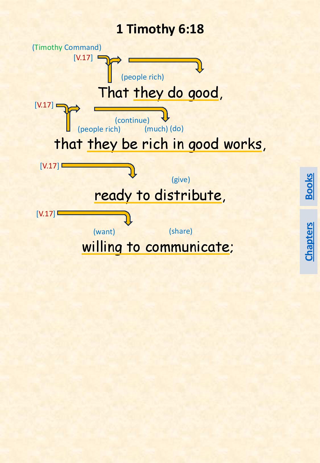 1Ti 6:18 That they do good, that they be rich in good works, ready to distribute, willing to communicate;