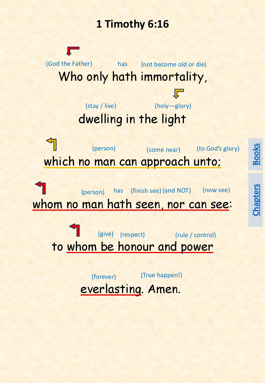 1Ti 6:16 Who only hath immortality, dwelling in the light which no man can approach unto; whom no man hath seen, nor can see: to whom be honour and power everlasting. Amen.