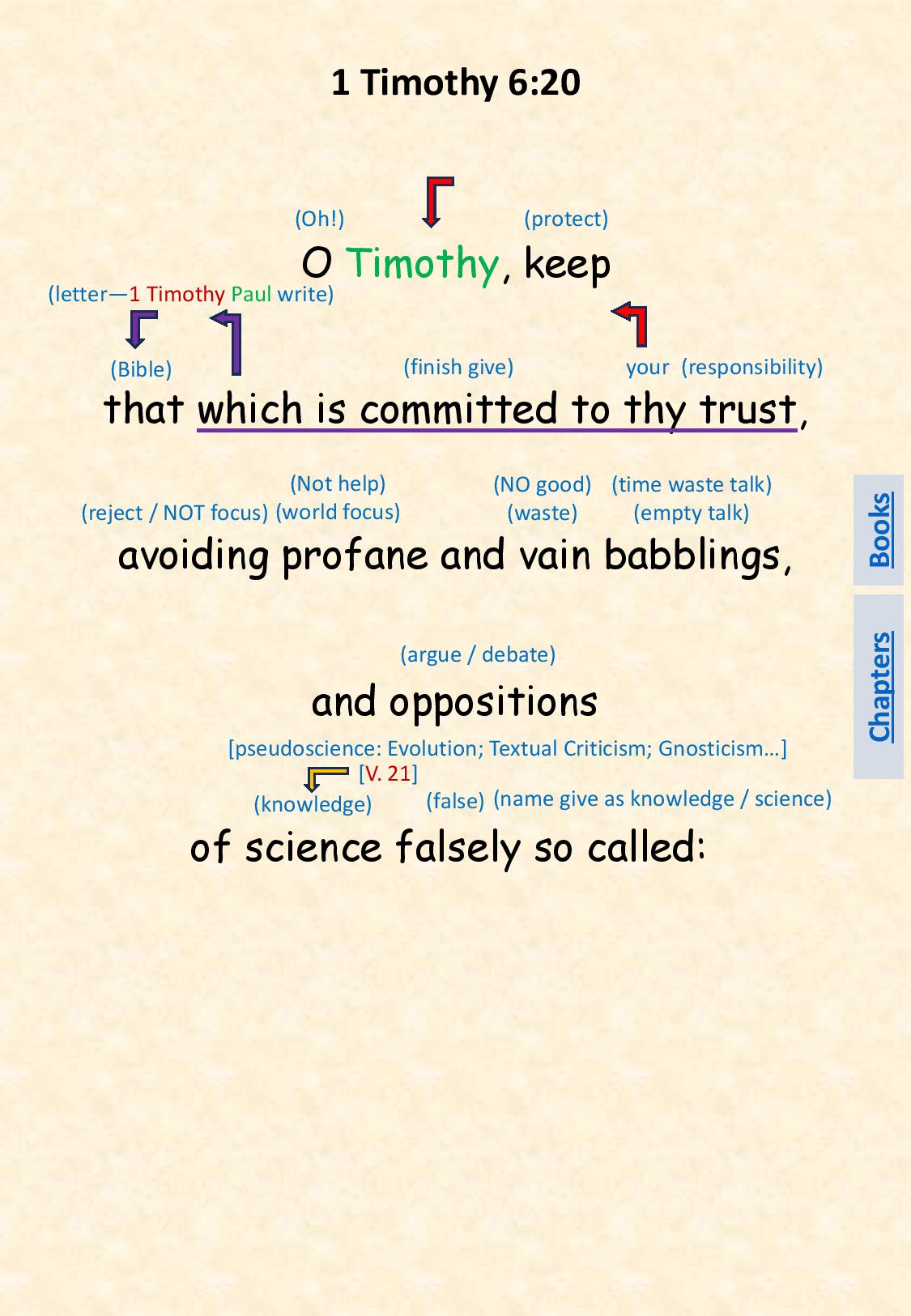 1Ti 6:20 O Timothy, keep that which is committed to thy trust, avoiding profane and vain babblings, and oppositions of science falsely so called: