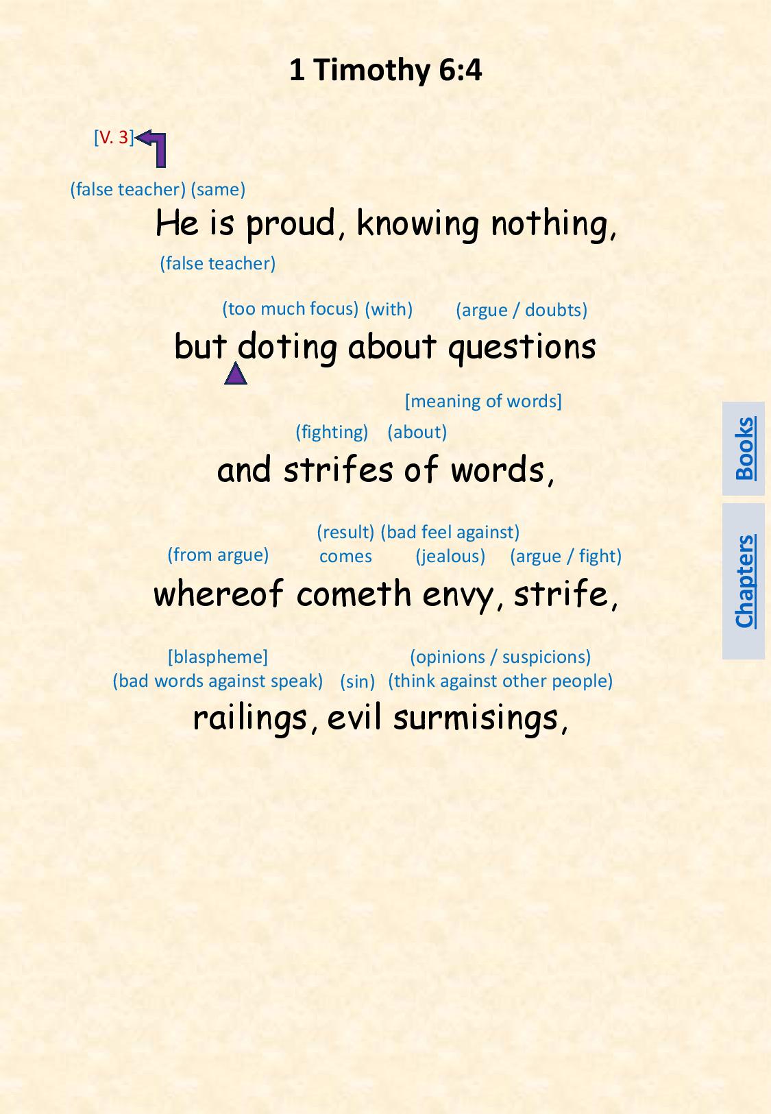 1Ti 6:4 He is proud, knowing nothing, but doting about questions and strifes of words, whereof cometh envy, strife, railings, evil surmisings,
