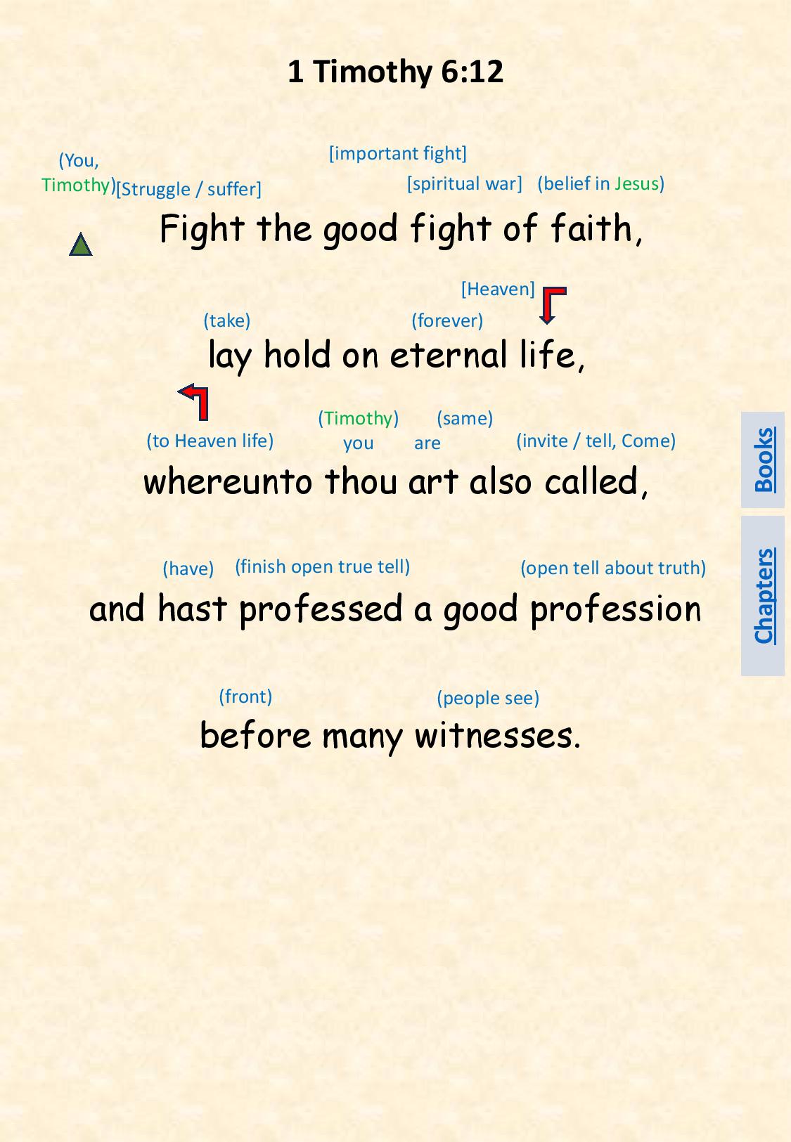 1Ti 6:12 Fight the good fight of faith, lay hold on eternal life, whereunto thou art also called, and hast professed a good profession before many witnesses.