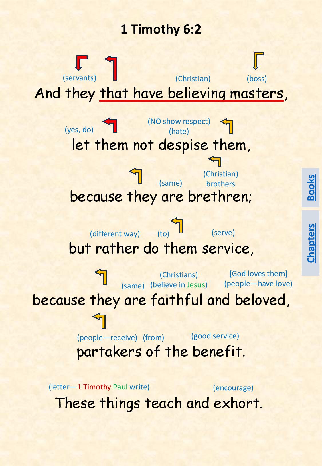 1Ti 6:2 And they that have believing masters, let them not despise them, because they are brethren; but rather do them service, because they are faithful and beloved, partakers of the benefit. These things teach and exhort.