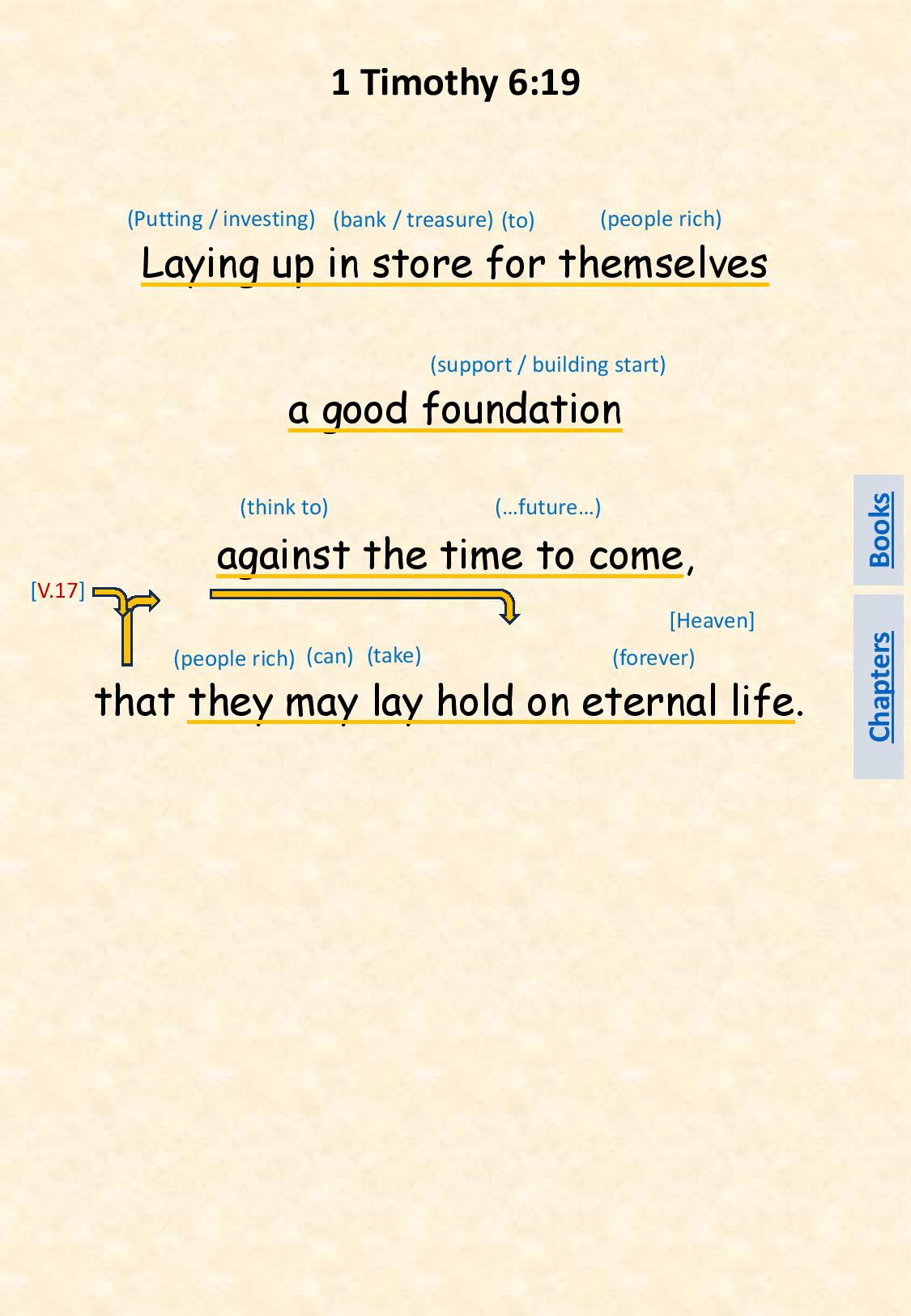 1Ti 6:19 Laying up in store for themselves a good foundation against the time to come, that they may lay hold on eternal life.