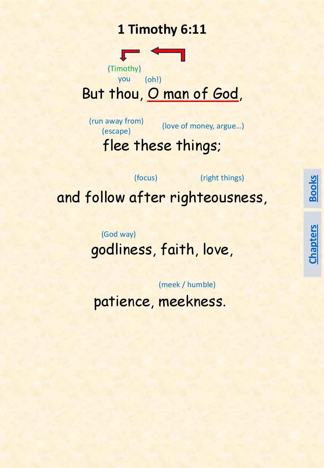 1Ti 6:11 But thou, O man of God, flee these things; and follow after righteousness, godliness, faith, love, patience, meekness.