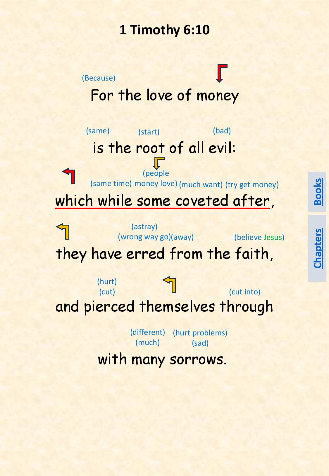 1Ti 6:10 For the love of money is the root of all evil: which while some coveted after, they have erred from the faith, and pierced themselves through with many sorrows.
