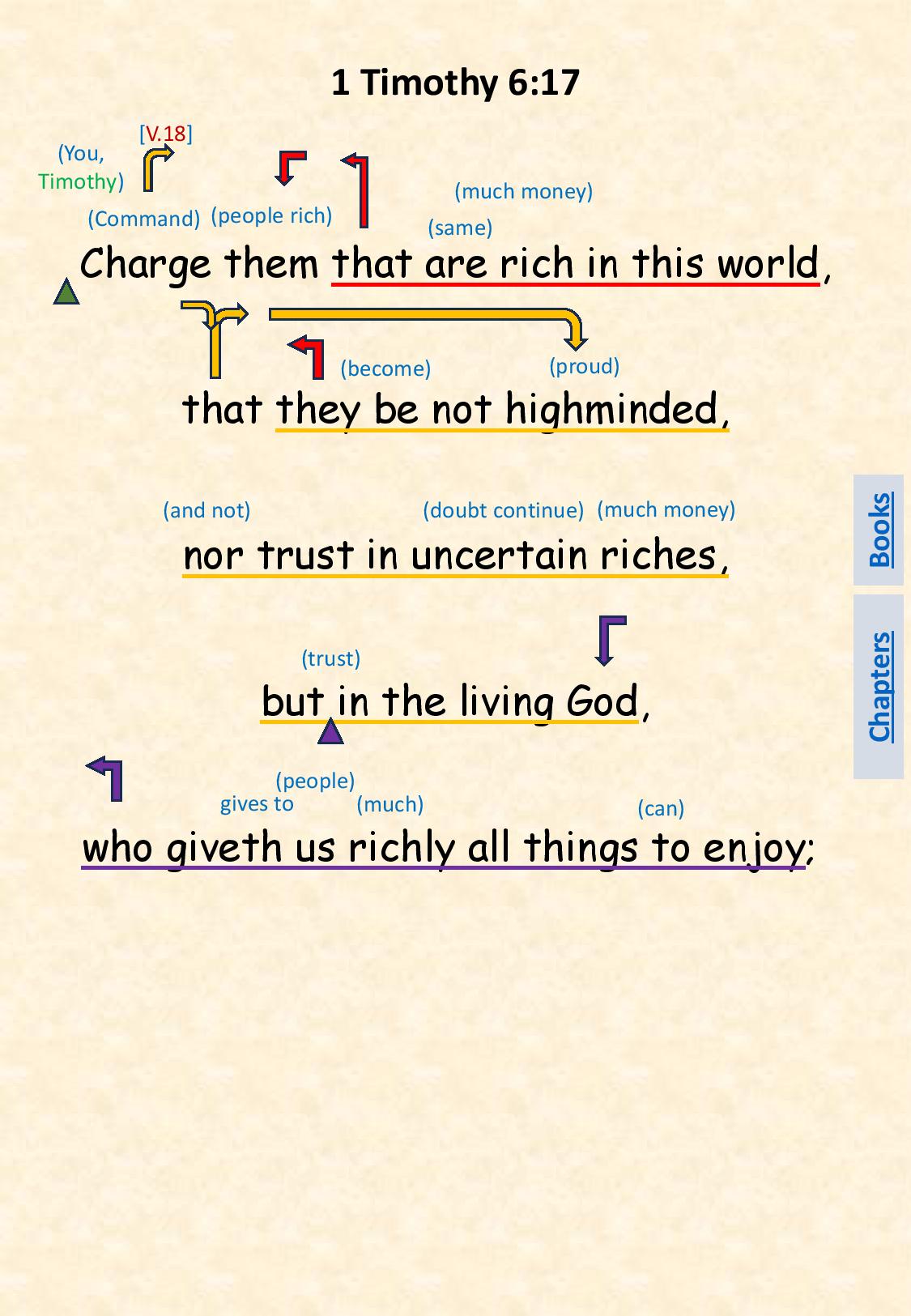 1Ti 6:17 Charge them that are rich in this world, that they be not highminded, nor trust in uncertain riches, but in the living God, who giveth us richly all things to enjoy;