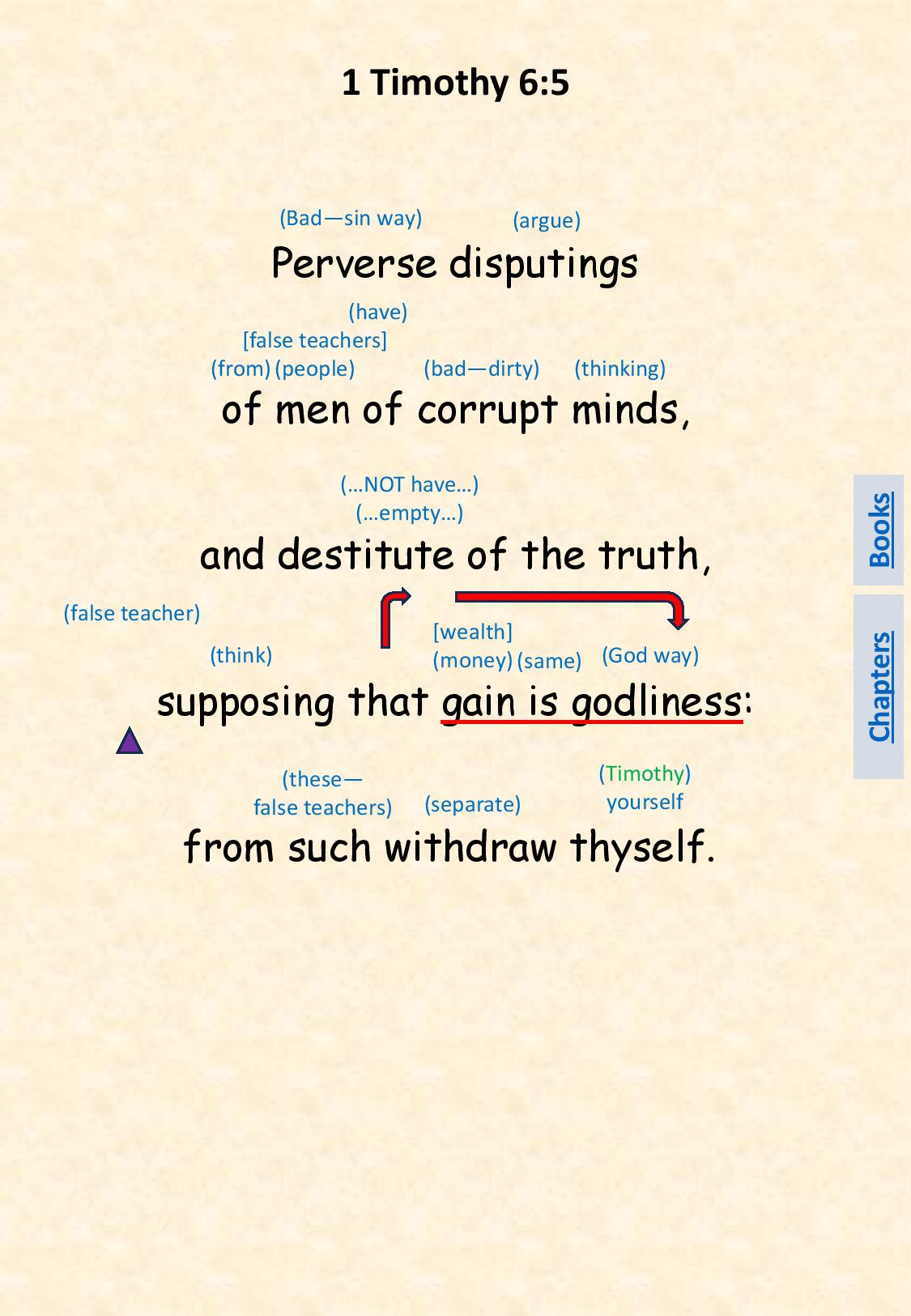 1Ti 6:5 Perverse disputings of men of corrupt minds, and destitute of the truth, supposing that gain is godliness: from such withdraw thyself.