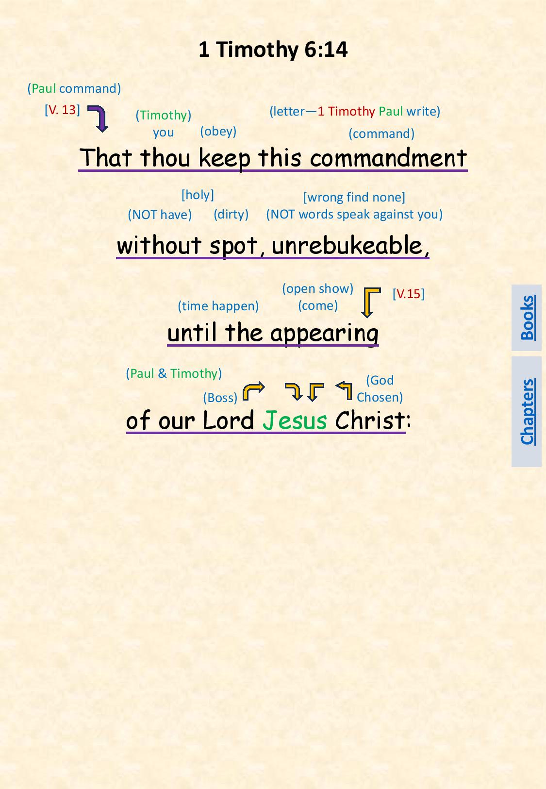 1Ti 6:14 That thou keep this commandment without spot, unrebukeable, until the appearing of our Lord Jesus Christ: