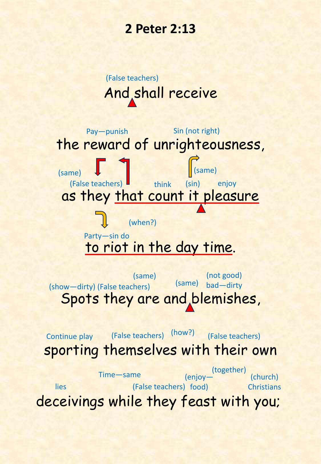 2Pe 2:13 And shall receive the reward of unrighteousness, as they that count it pleasure to riot in the day time. Spots they are and blemishes, sporting themselves with their own deceivings while they feast with you;