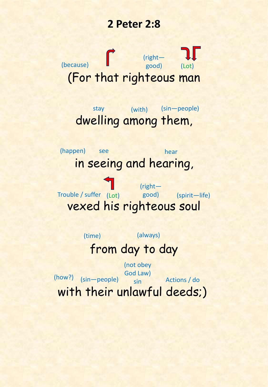 2Pe 2:8 (For that righteous man dwelling among them, in seeing and hearing, vexed his righteous soul from day to day with their unlawful deeds;)
