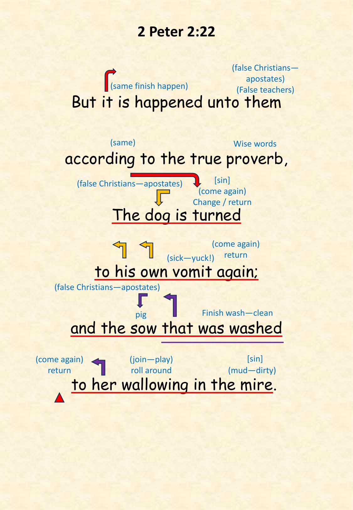 2Pe 2:22 But it is happened unto them according to the true proverb, The dog is turned to his own vomit again; and the sow that was washed to her wallowing in the mire.