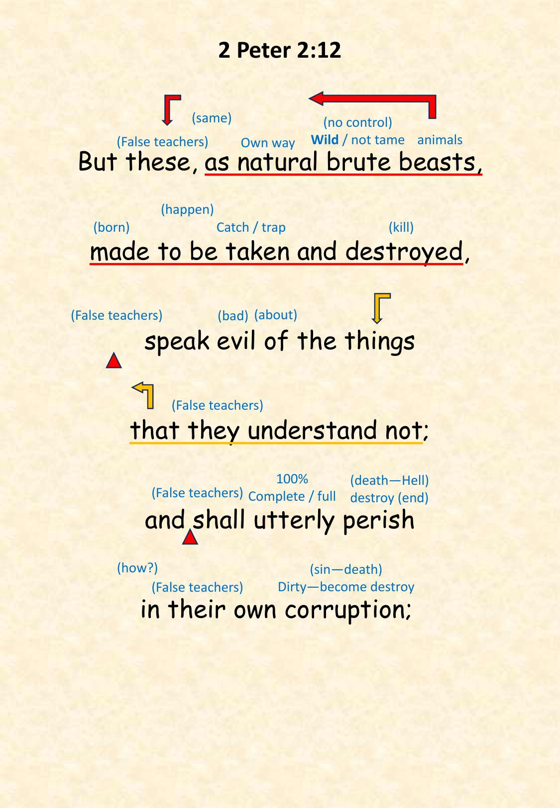 2Pe 2:12 But these, as natural brute beasts, made to be taken and destroyed, speak evil of the things that they understand not; and shall utterly perish in their own corruption;