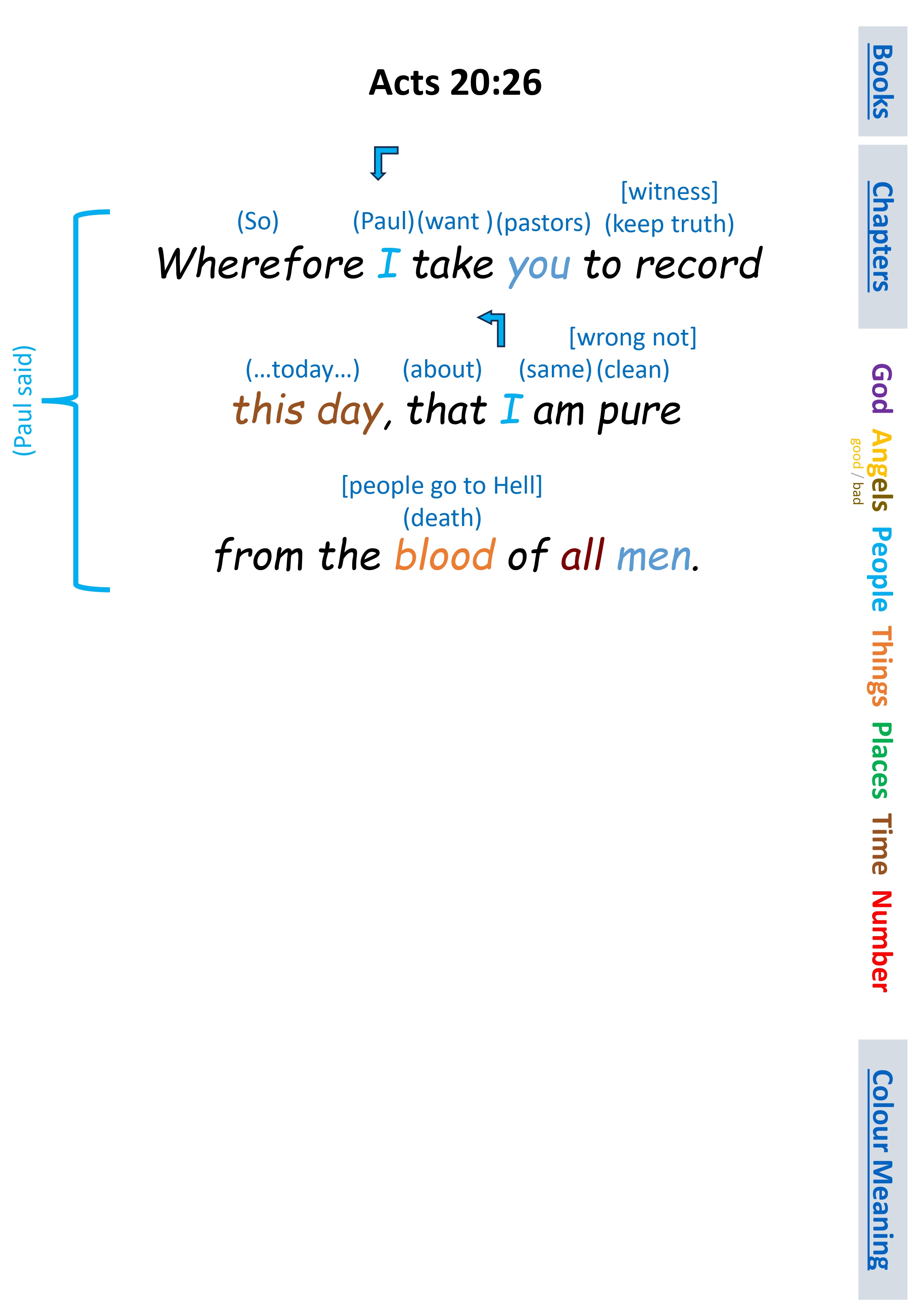 Act 20:26 Wherefore I take you to record this day, that I am pure from the blood of all men.