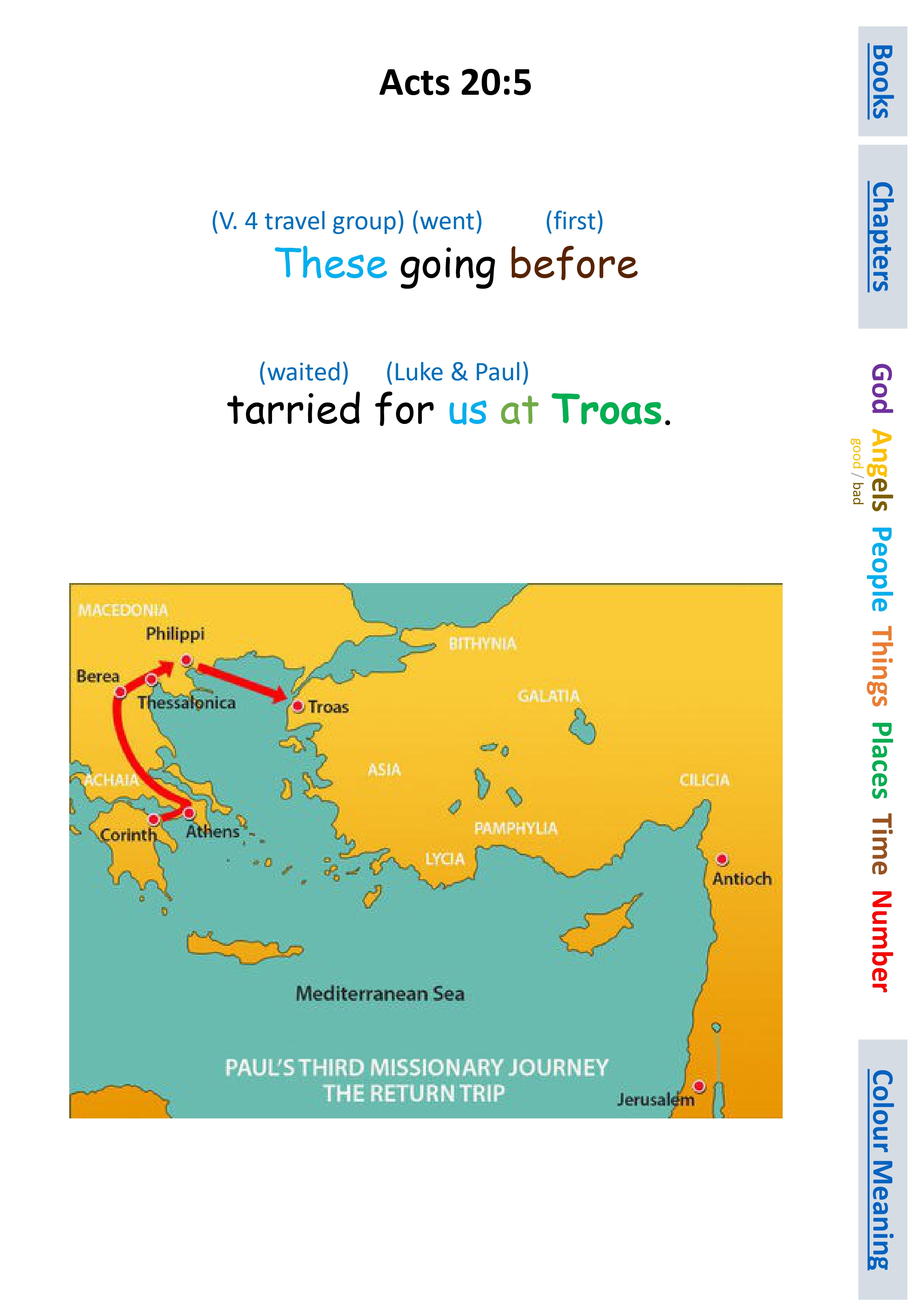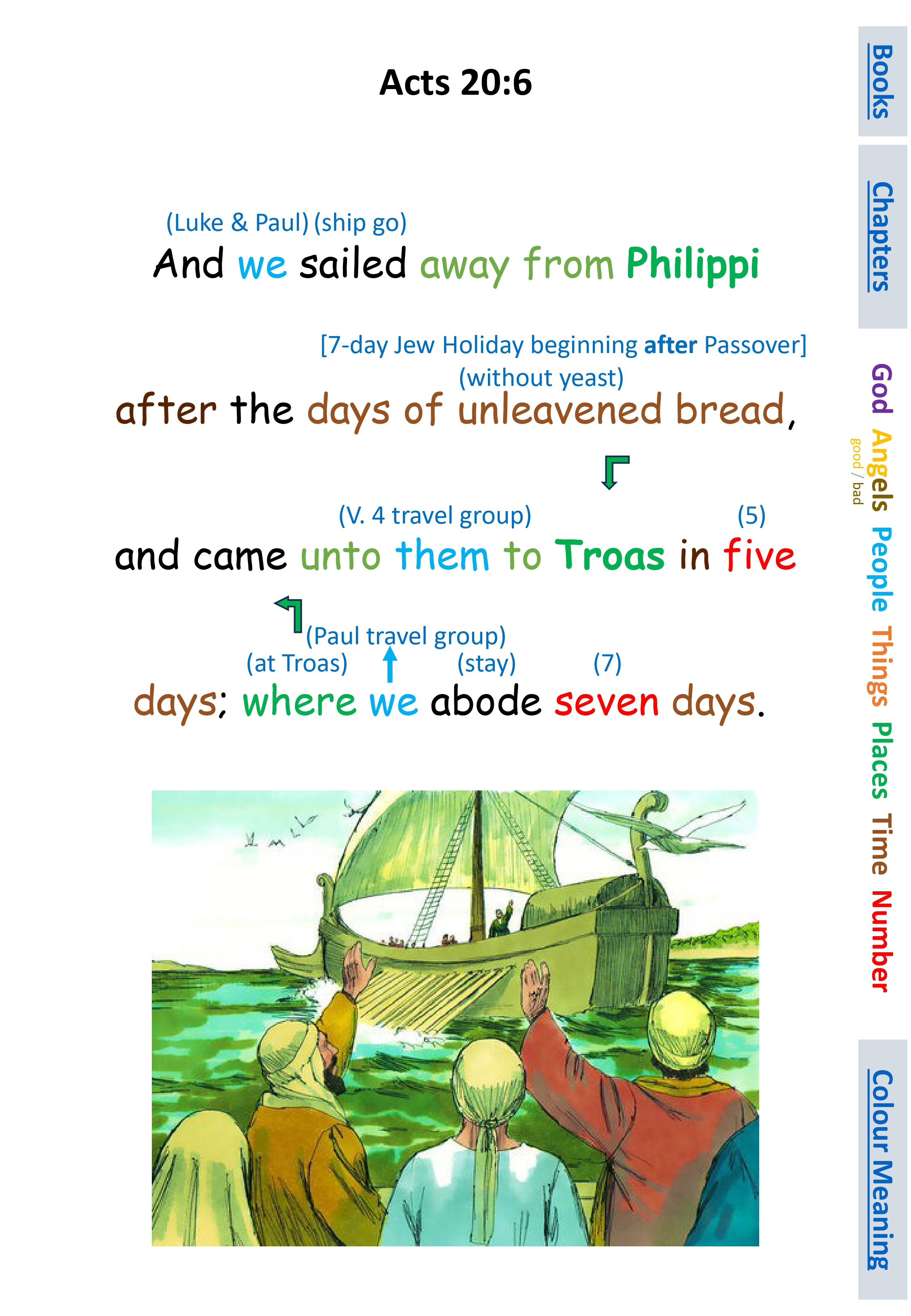 Act 20:6 And we sailed away from Philippi after the days of unleavened bread, and came unto them to Troas in five days; where we abode seven days.