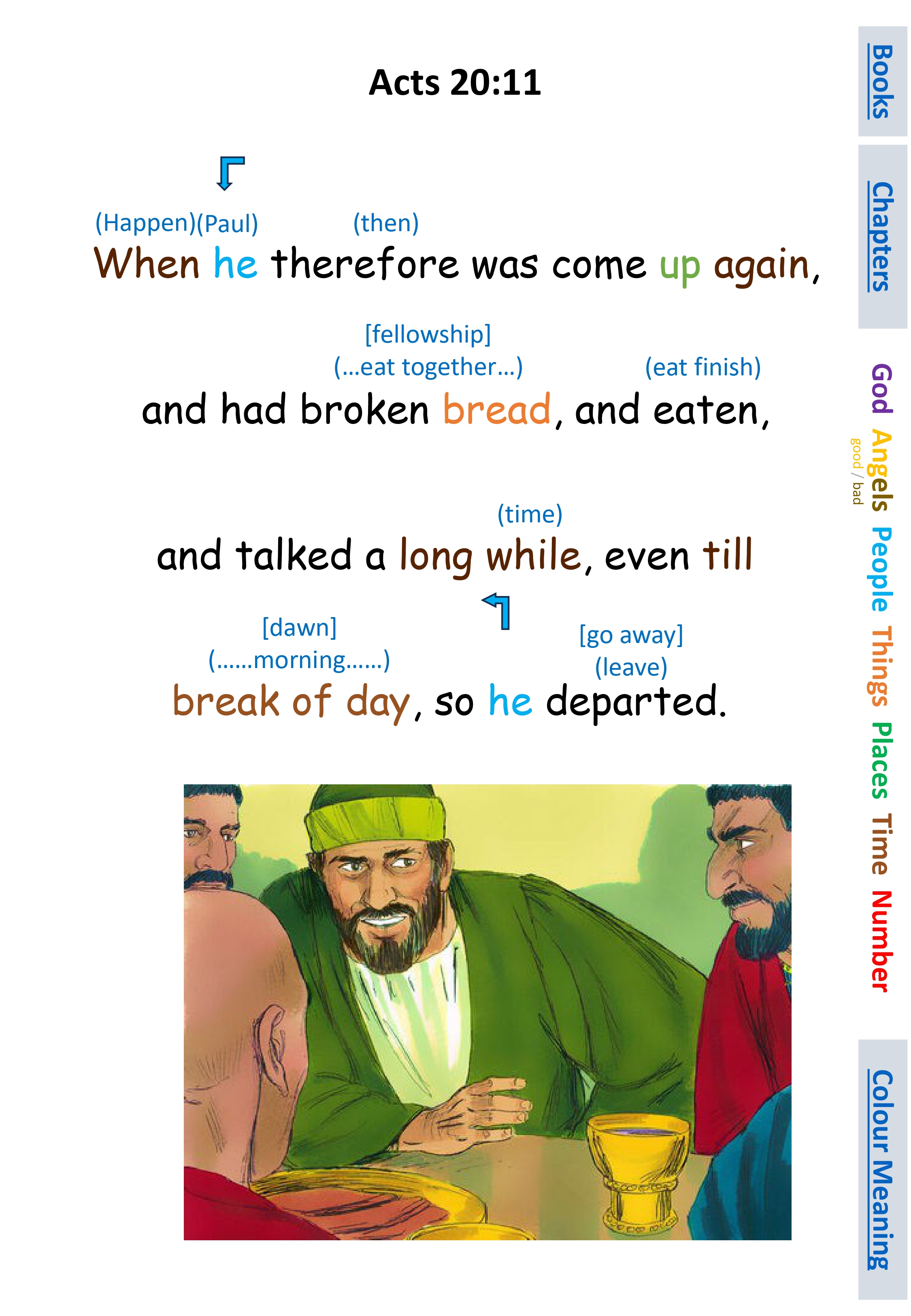 Act 20:11 When he therefore was come up again, and had broken bread, and eaten, and talked a long while, even till break of day, so he departed.