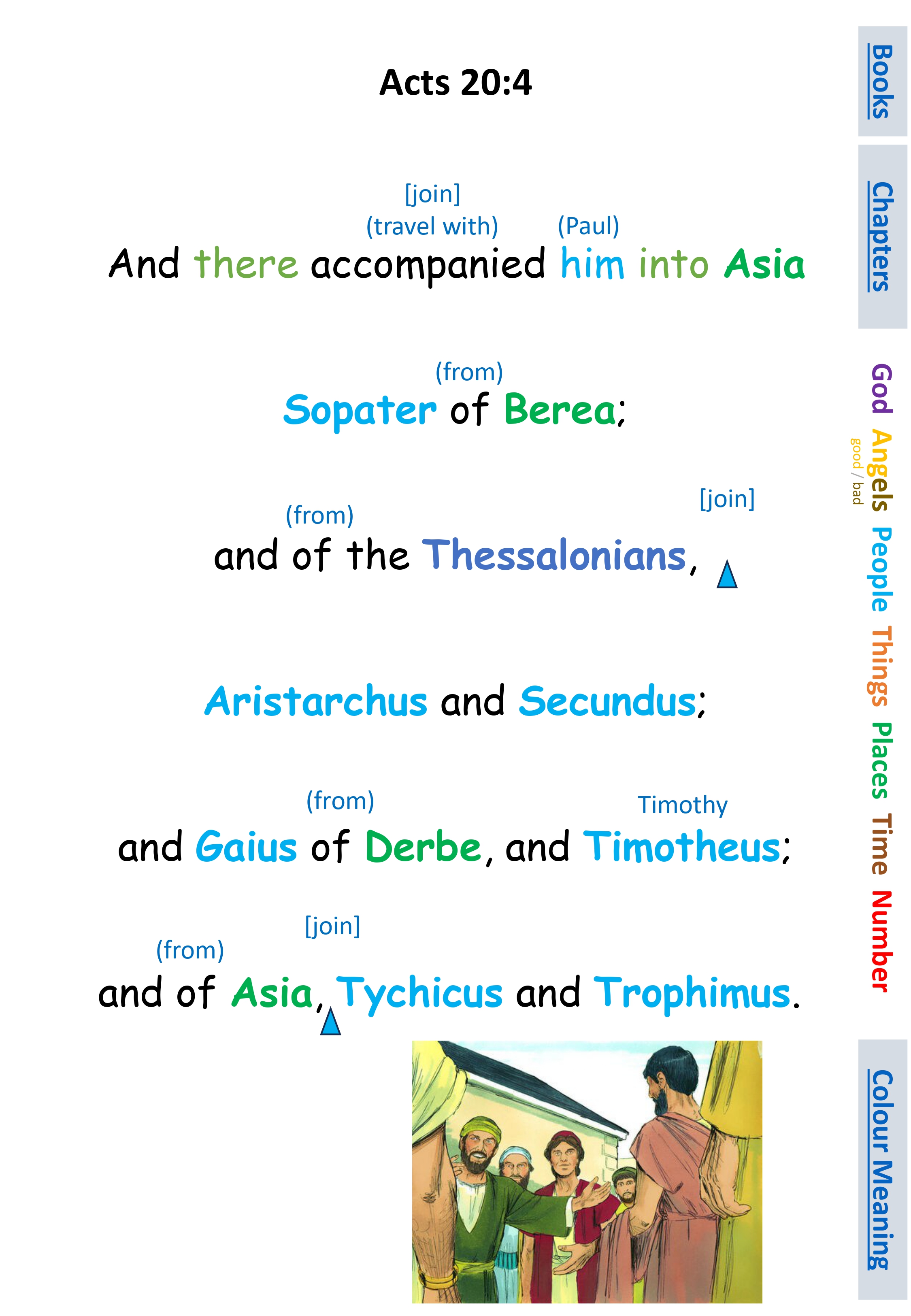 Act 20:4 And there accompanied him into Asia Sopater of Berea; and of the Thessalonians, Aristarchus and Secundus; and Gaius of Derbe, and Timotheus; and of Asia, Tychicus and Trophimus.