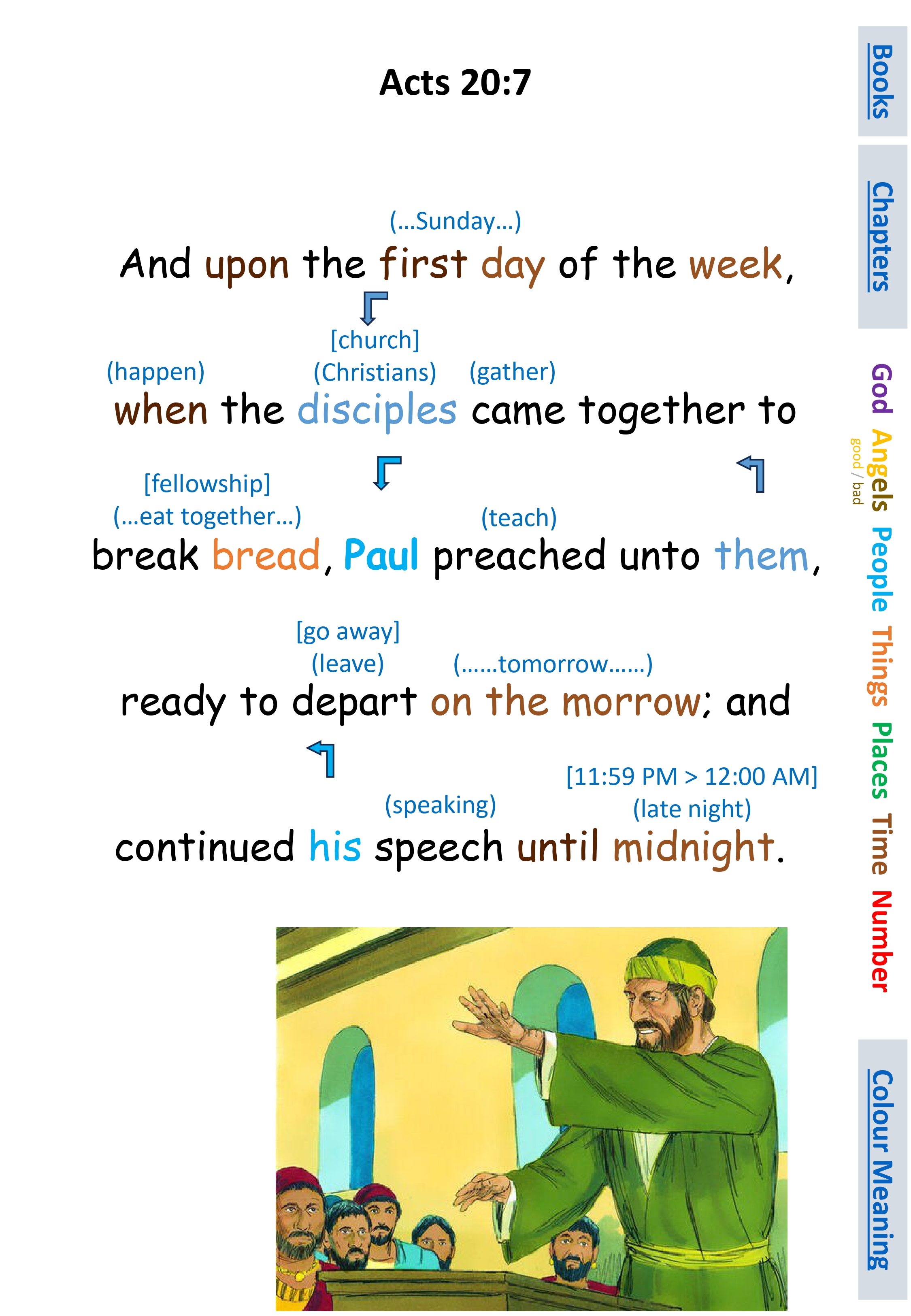 Act 20:7 And upon the first day of the week, when the disciples came together to break bread, Paul preached unto them, ready to depart on the morrow; and continued his speech until midnight.