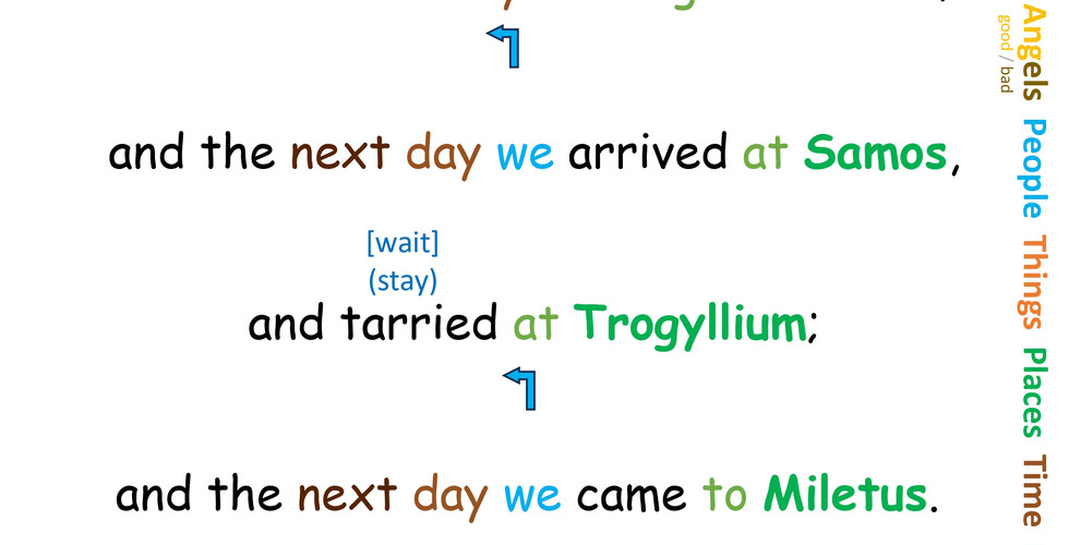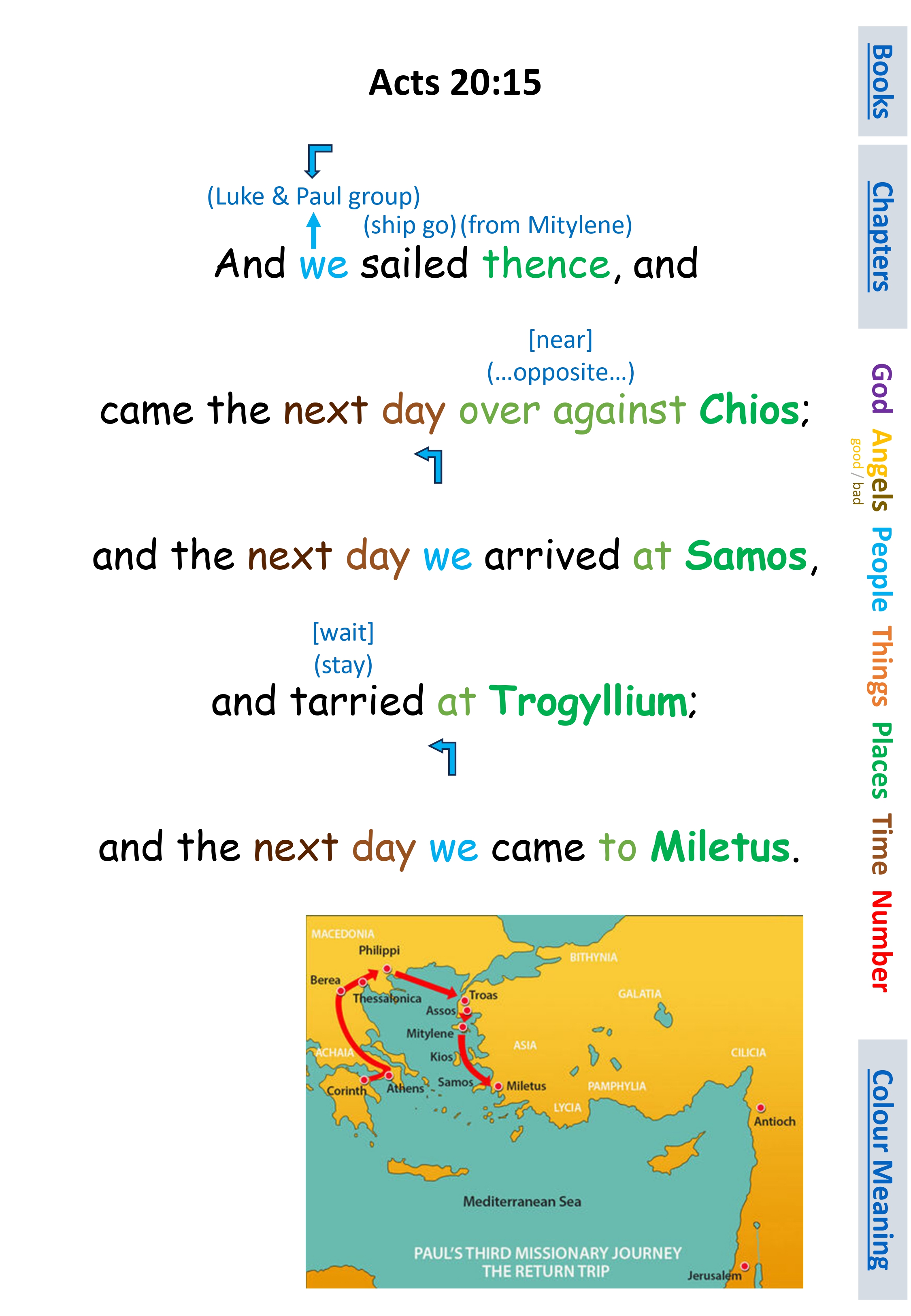 Act 20:15 And we sailed thence, and came the next day over against Chios; and the next day we arrived at Samos, and tarried at Trogyllium; and the next day we came to Miletus.