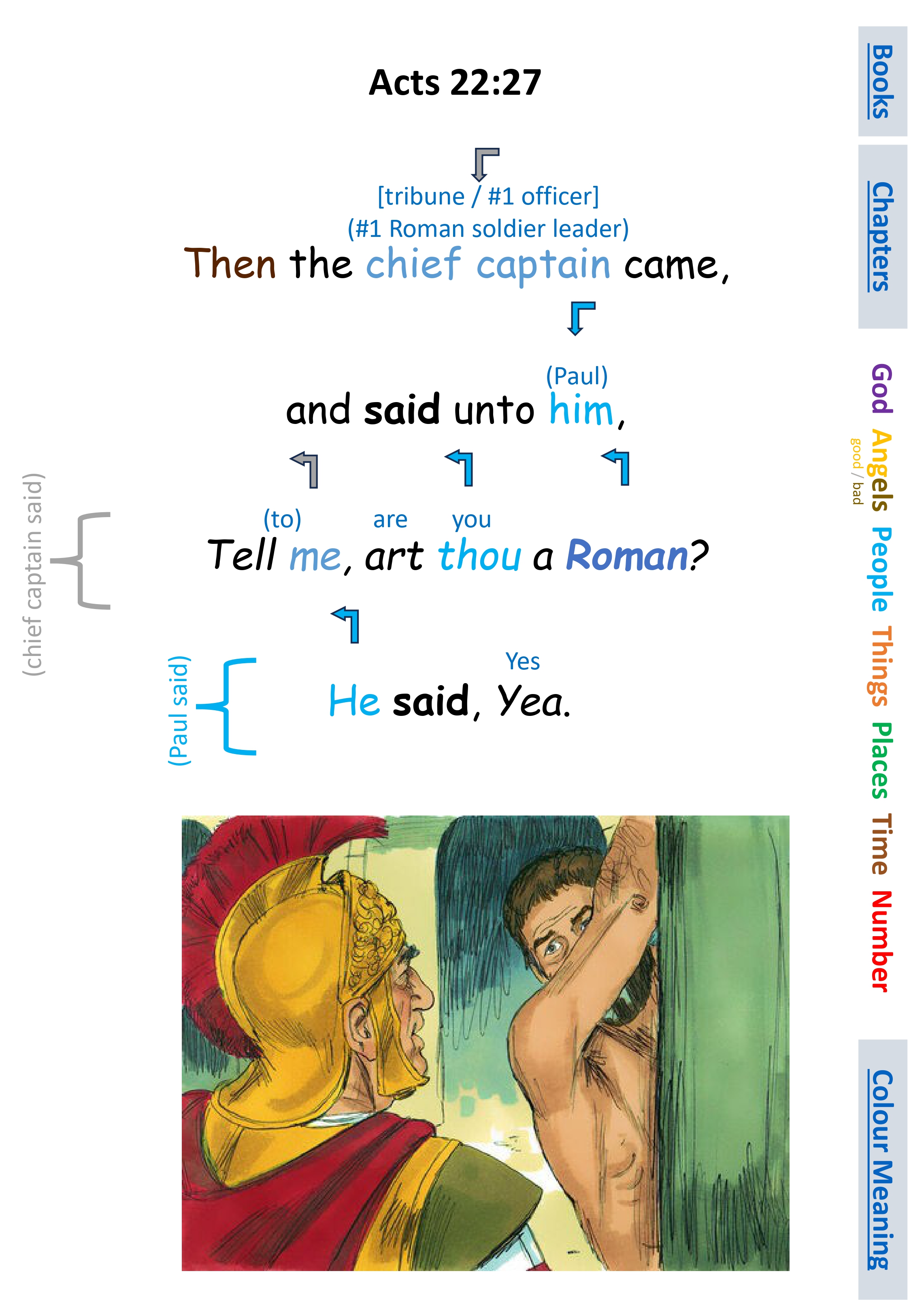 Act 22:27 Then the chief captain came, and said unto him, Tell me, art thou a Roman? He said, Yea.
