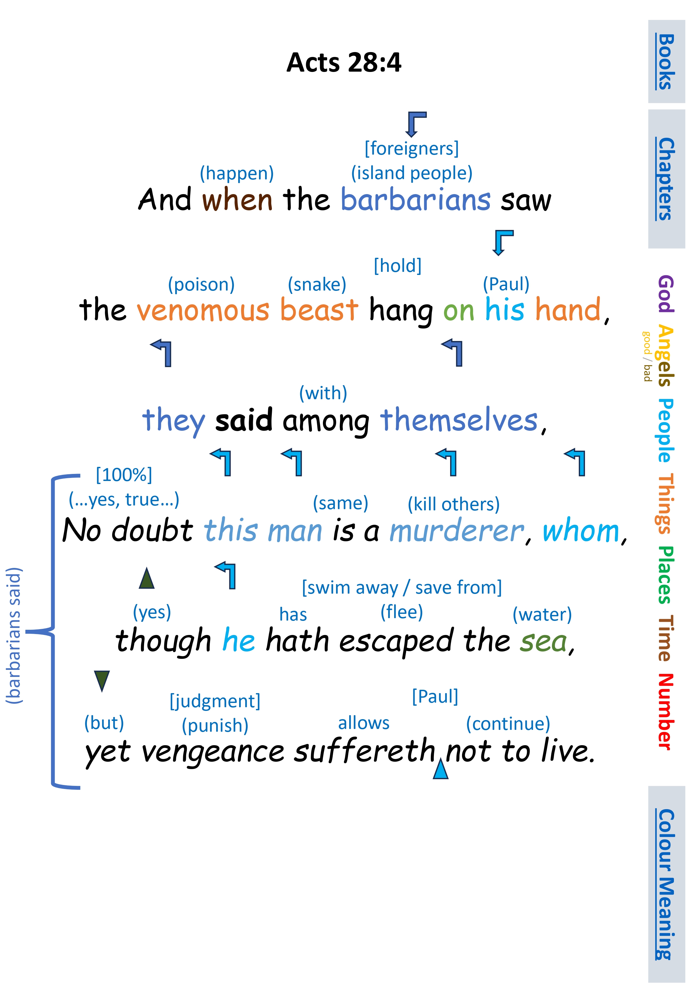 Act 28:4 And when the barbarians saw the venomous beast hang on his hand, they said among themselves, No doubt this man is a murderer, whom, though he hath escaped the sea, yet vengeance suffereth not to live.