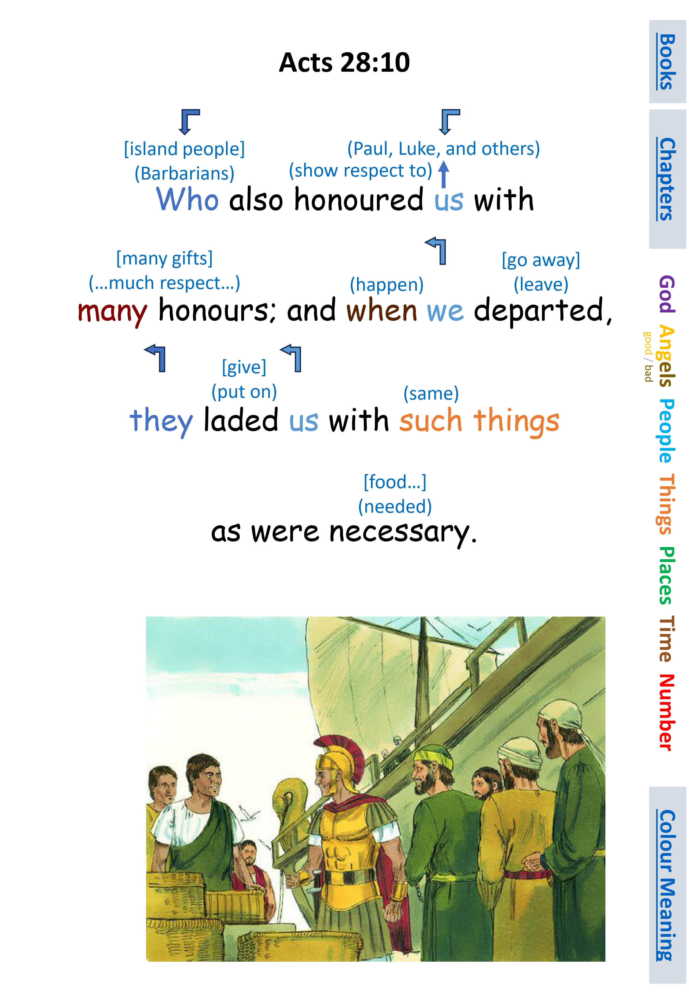 Act 28:10 Who also honoured us with many honours; and when we departed, they laded us with such things as were necessary.