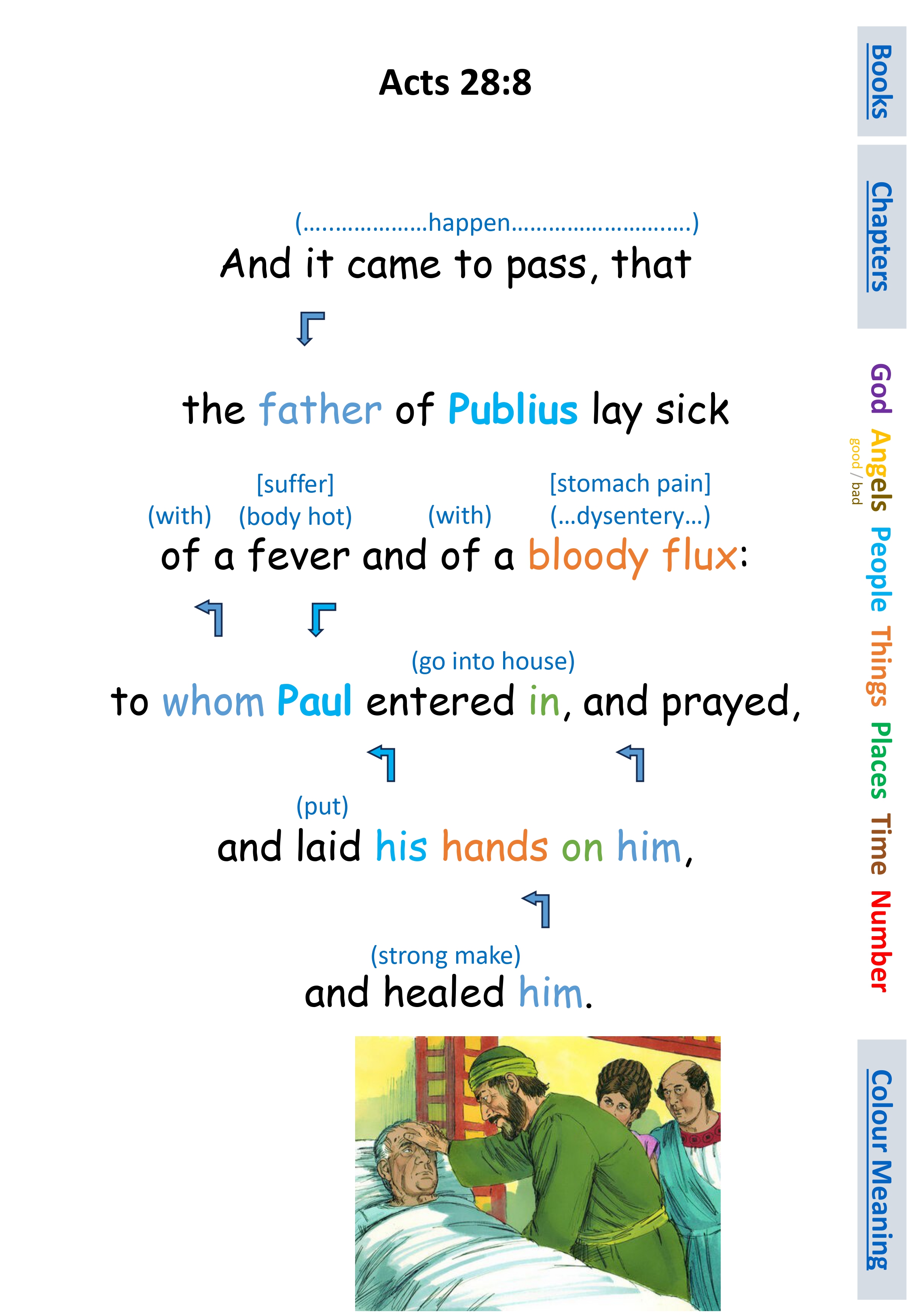 Act 28:8 And it came to pass, that the father of Publius lay sick of a fever and of a bloody flux: to whom Paul entered in, and prayed, and laid his hands on him, and healed him.