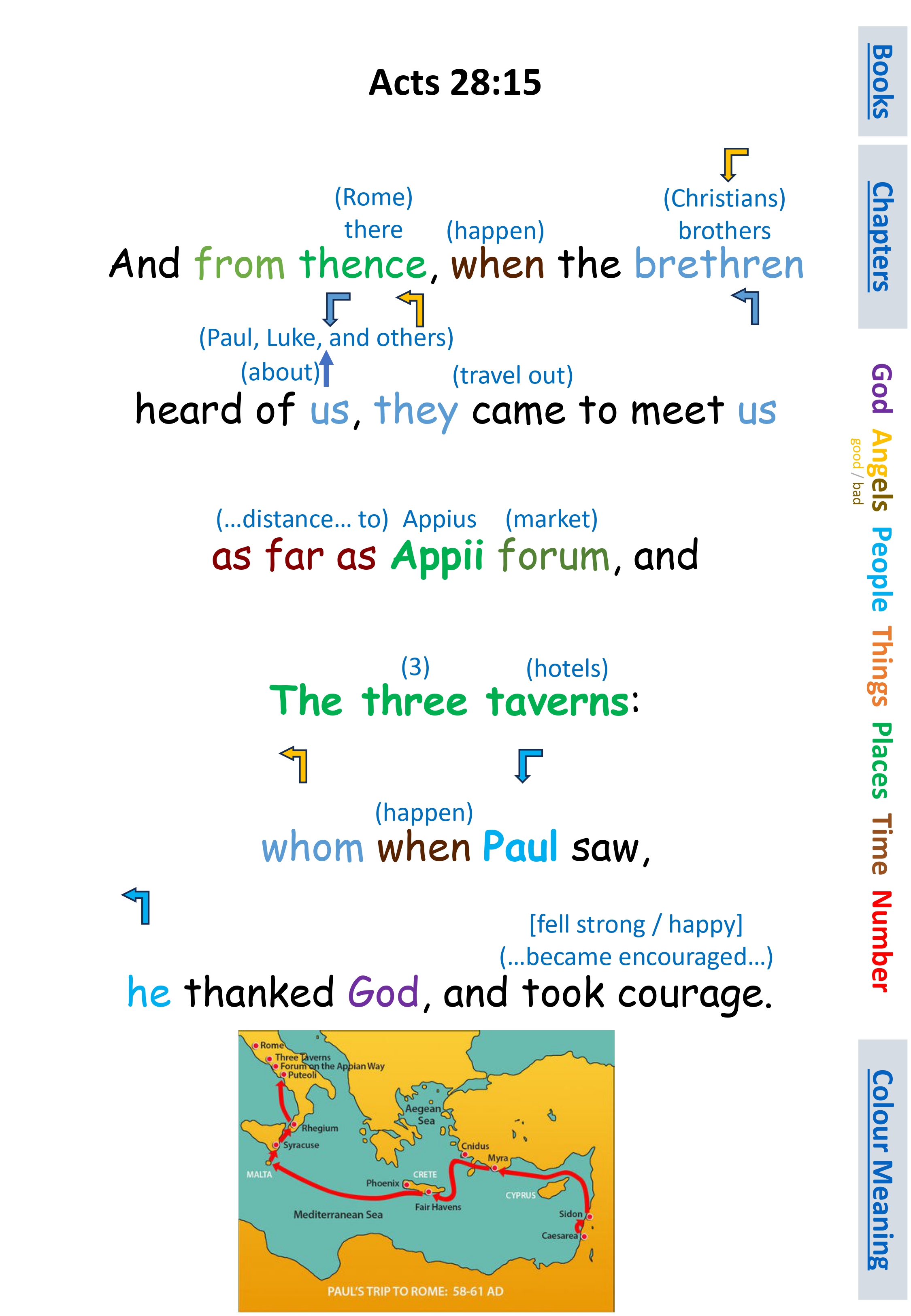 Act 28:15 And from thence, when the brethren heard of us, they came to meet us as far as Appii forum, and The three taverns: whom when Paul saw, he thanked God, and took courage.