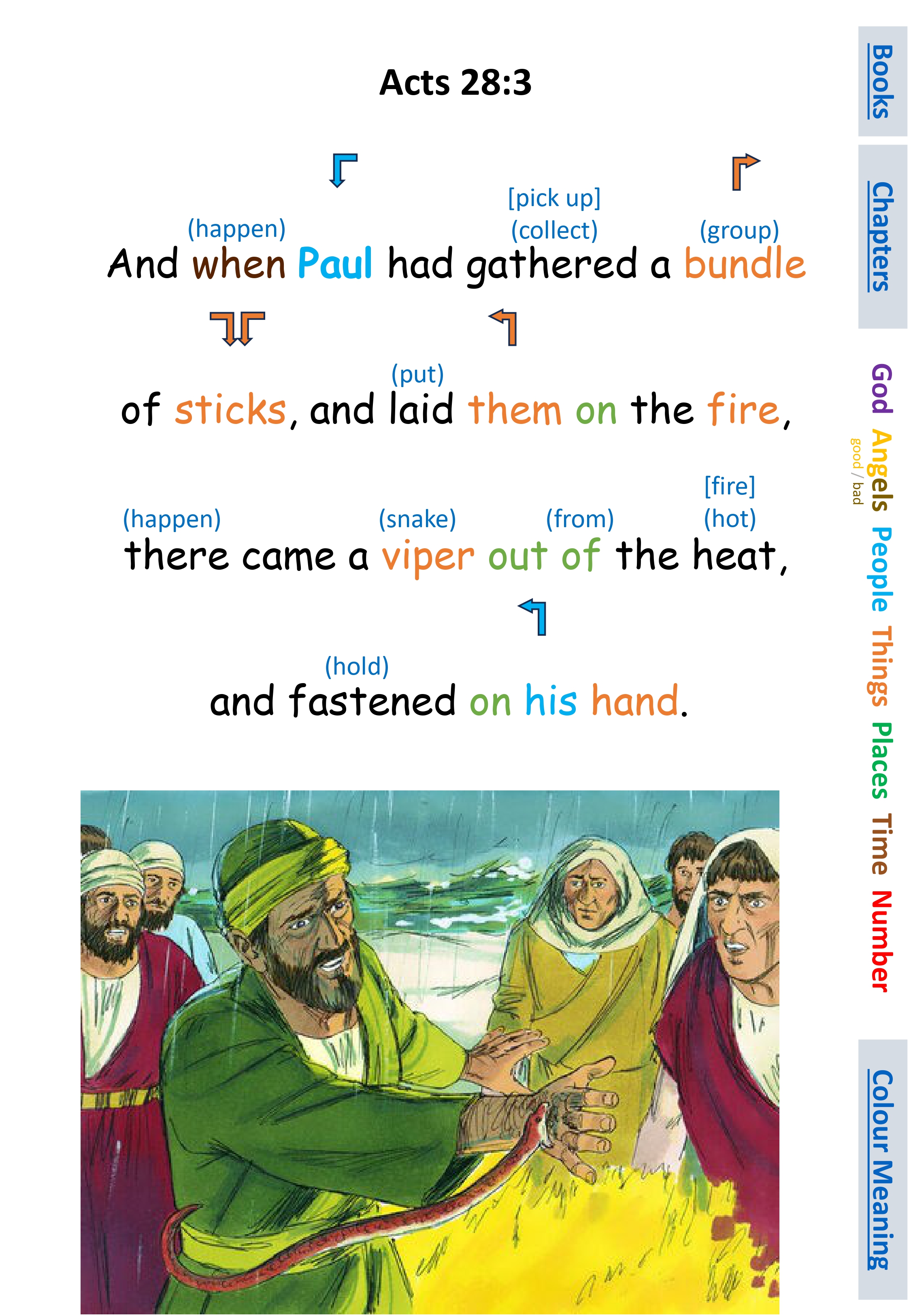Act 28:3 And when Paul had gathered a bundle of sticks, and laid them on the fire, there came a viper out of the heat, and fastened on his hand.