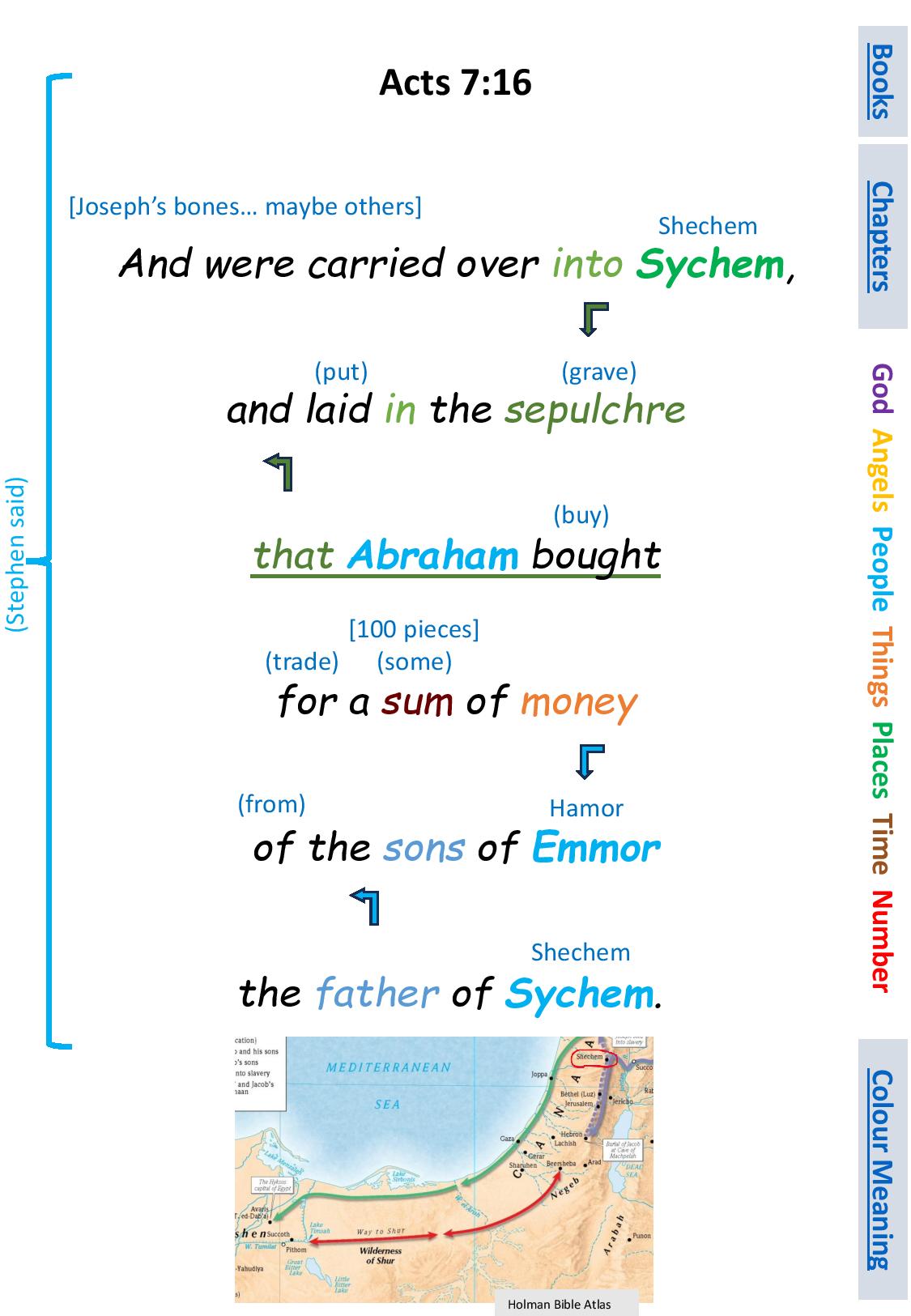Act 7:16 And were carried over into Sychem, and laid in the sepulchre that Abraham bought for a sum of money of the sons of Emmor the father of Sychem.