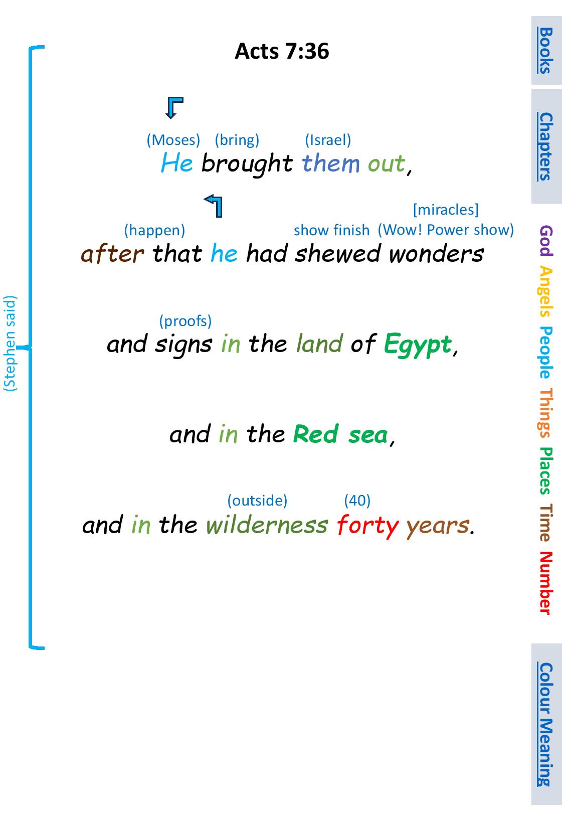 Act 7:36 He brought them out, after that he had shewed wonders and signs in the land of Egypt, and in the Red sea, and in the wilderness forty years.