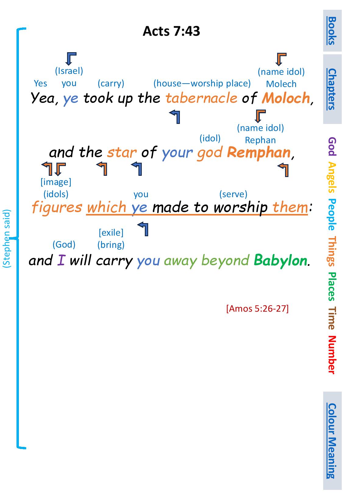 Act 7:43 Yea, ye took up the tabernacle of Moloch, and the star of your god Remphan, figures which ye made to worship them: and I will carry you away beyond Babylon.