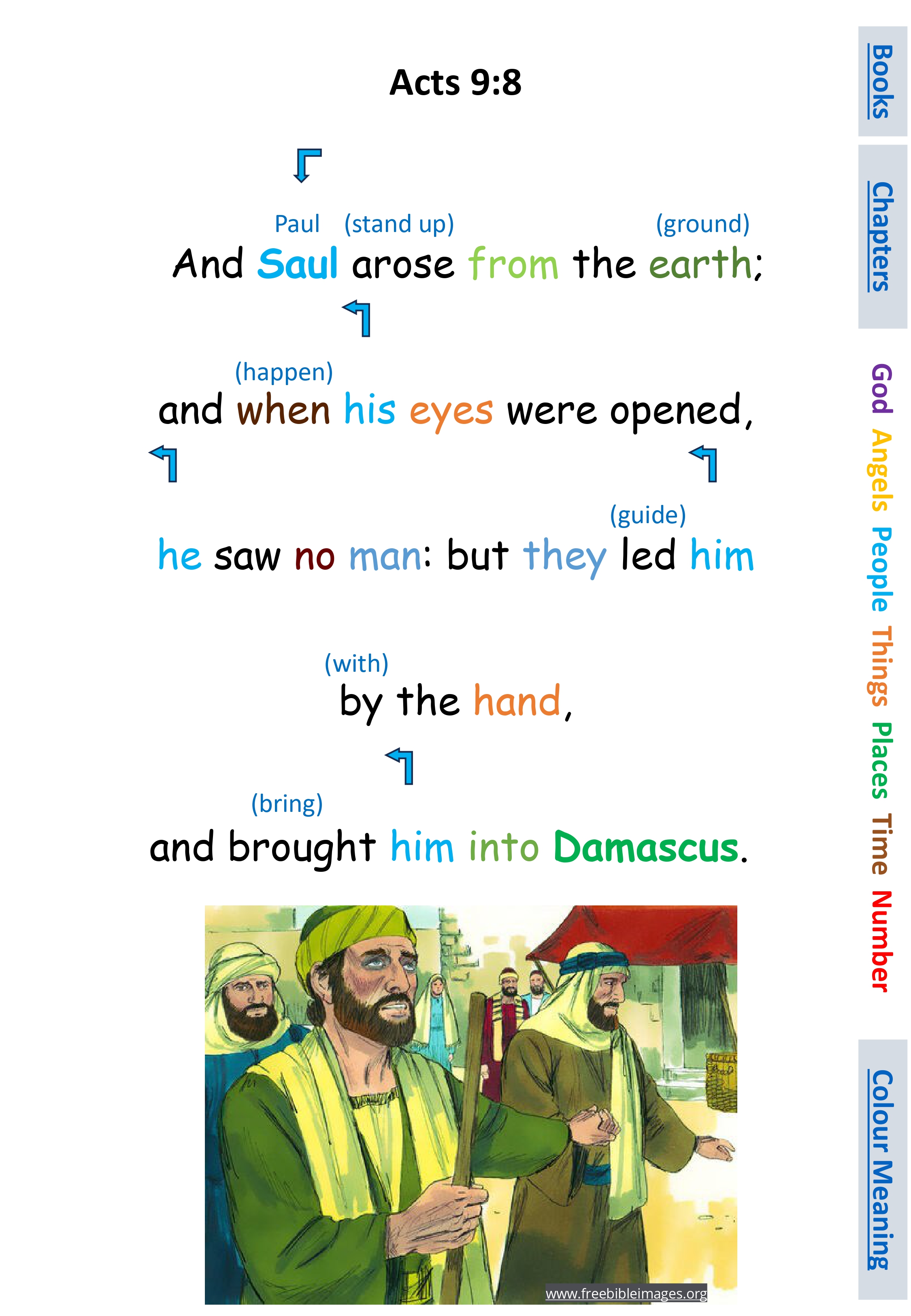 Act 9:8 And Saul arose from the earth; and when his eyes were opened, he saw no man: but they led him by the hand, and brought him into Damascus.