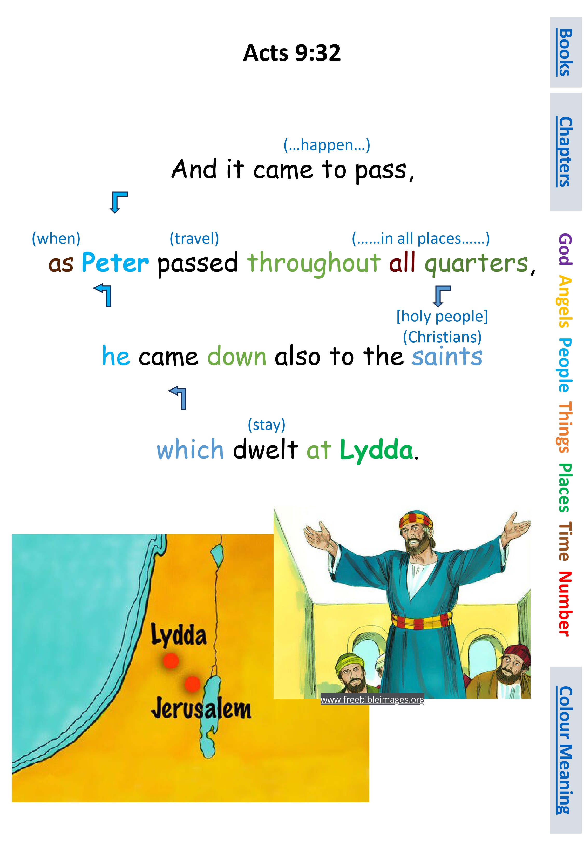 Act 9:32 And it came to pass, as Peter passed throughout all quarters, he came down also to the saints which dwelt at Lydda.