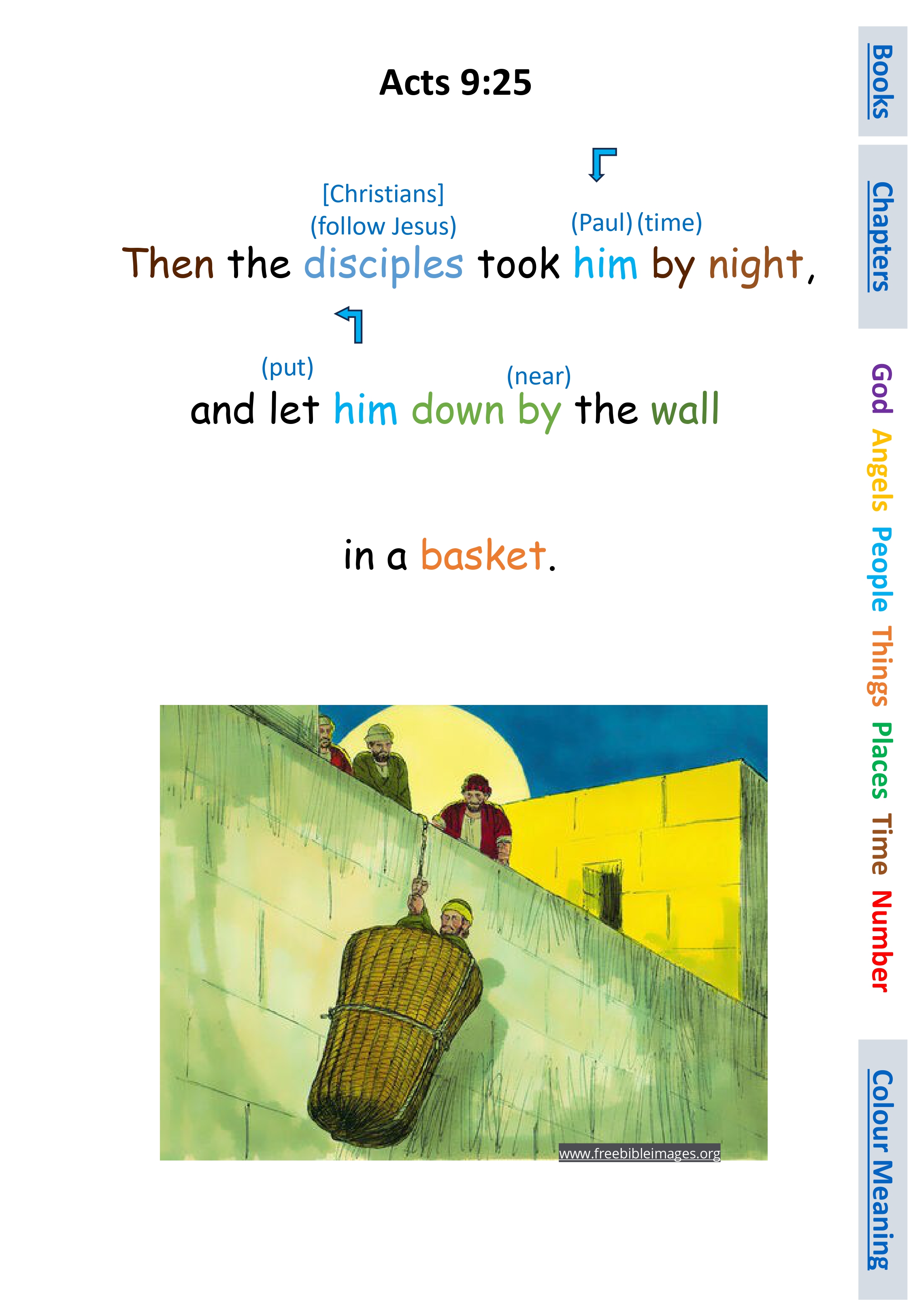 Act 9:25 Then the disciples took him by night, and let him down by the wall in a basket.