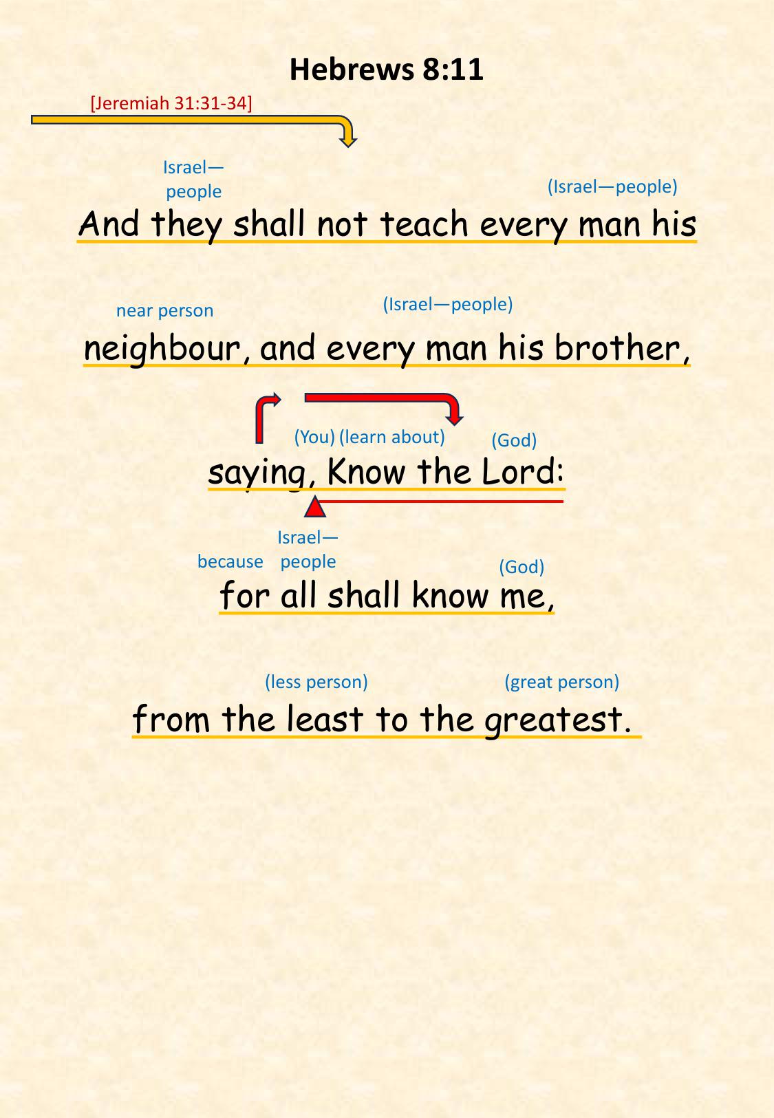Heb 8:11 And they shall not teach every man his neighbour, and every man his brother, saying, Know the Lord: for all shall know me, from the least to the greatest.