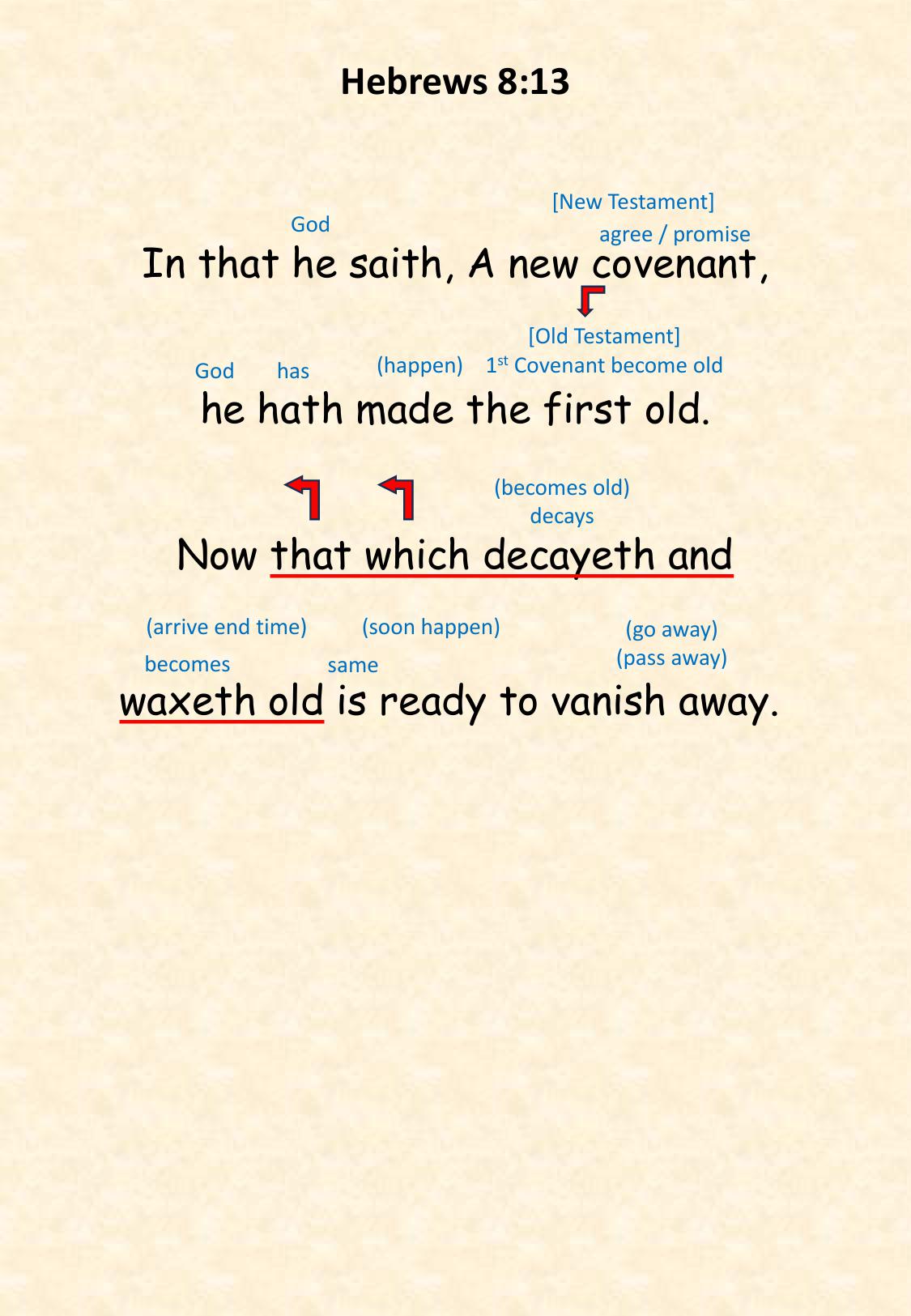 Heb 8:13 In that he saith, A new covenant, he hath made the first old. Now that which decayeth and waxeth old is ready to vanish away.