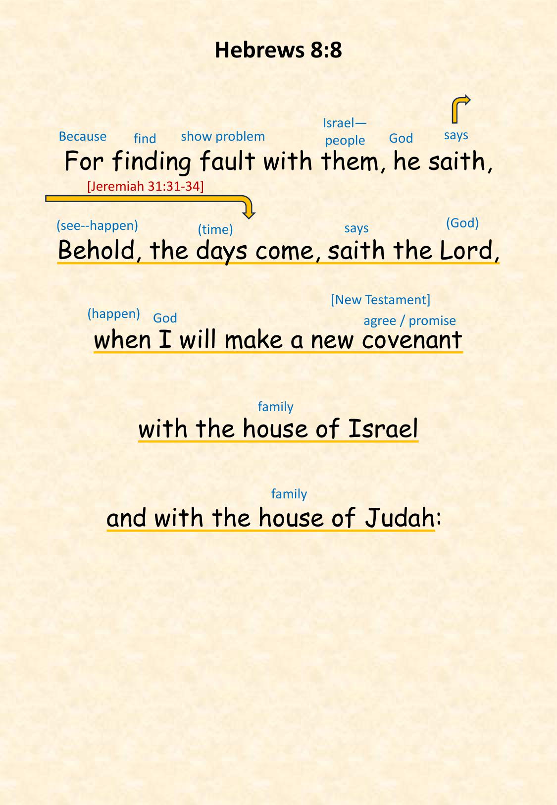 Heb 8:8 For finding fault with them, he saith, Behold, the days come, saith the Lord, when I will make a new covenant with the house of Israel and with the house of Judah: