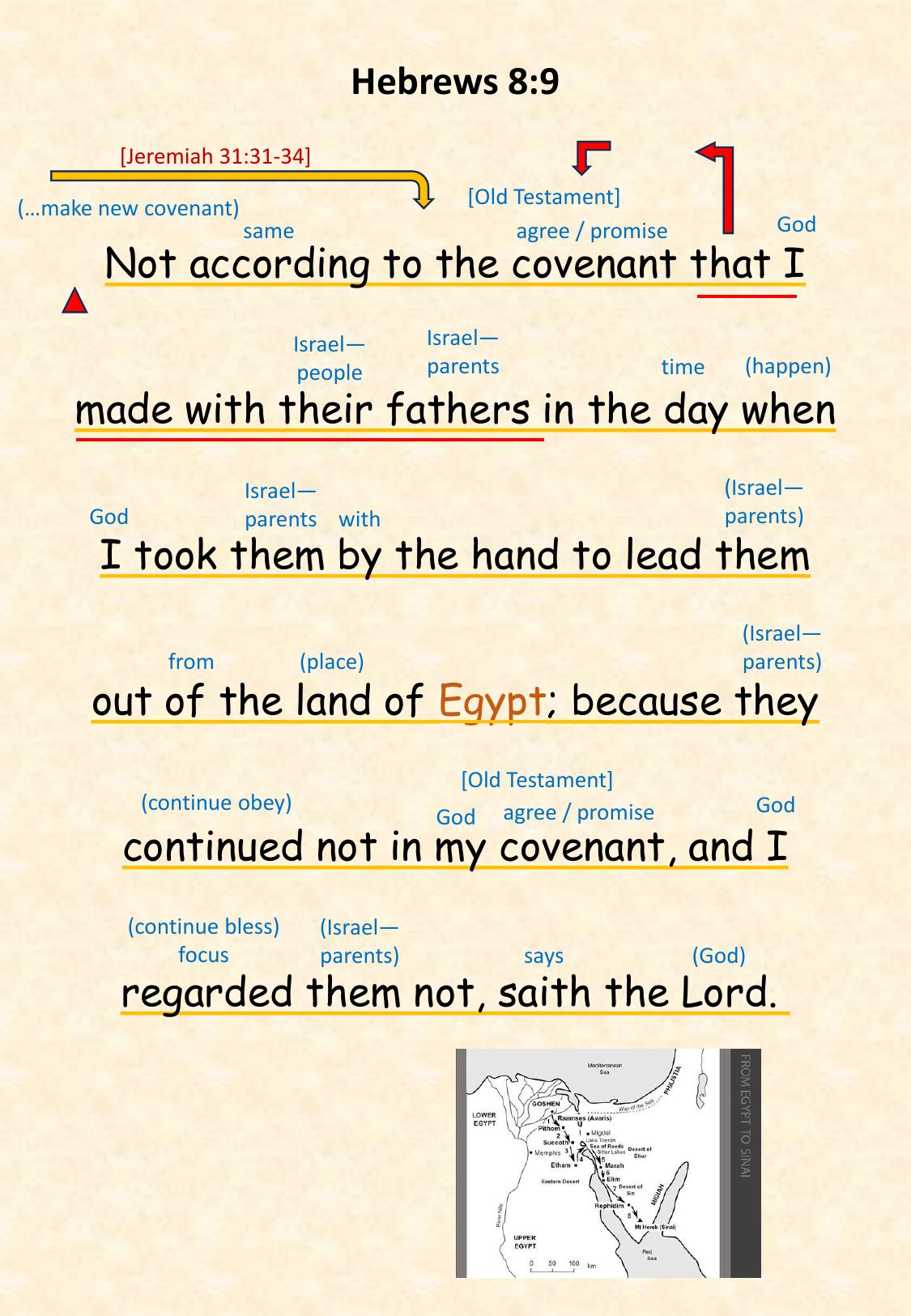 Heb 8:9 Not according to the covenant that I made with their fathers in the day when I took them by the hand to lead them out of the land of Egypt; because they continued not in my covenant, and I regarded them not, saith the Lord.