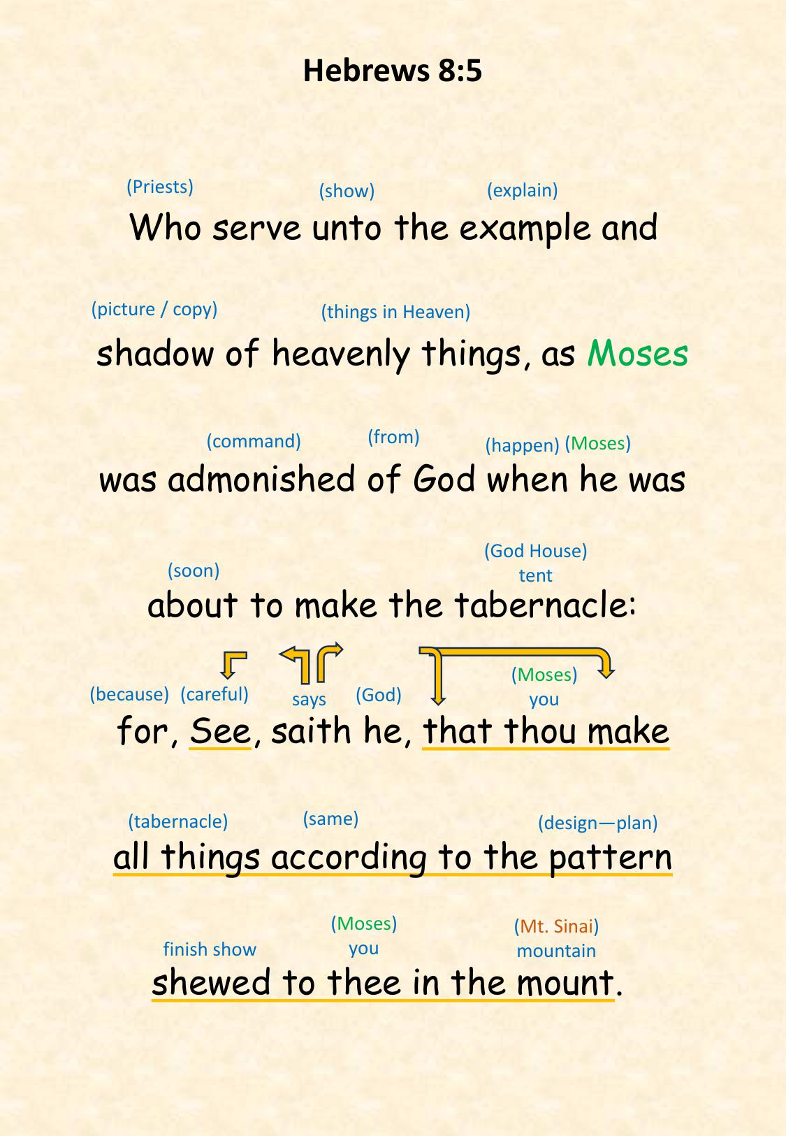 Heb 8:5 Who serve unto the example and shadow of heavenly things, as Moses was admonished of God when he was about to make the tabernacle: for, See, saith he, that thou make all things according to the pattern shewed to thee in the mount.